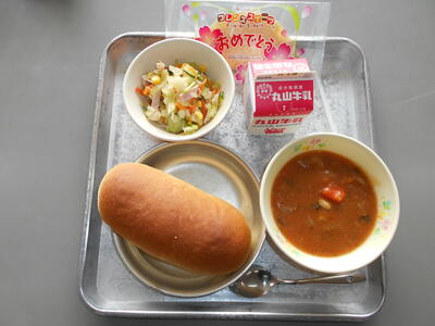 3月22日(金)、献立名(ビーフシチュー・そらとぶフレッシュサラダ・デザート)明日は卒業式。6年生にとっては今日が小学校最後の給食になります。学校のリーダーとして、朝の挨拶運動をはじめ、学校の行事では率先してみんなを引っ張ってきてくれましたね。小学校で身につけたことを大切にして、中学校生活を楽しんでくださいね。今まで本当にありがとうございました。今日は、卒業をお祝いして、デザートをつけています。