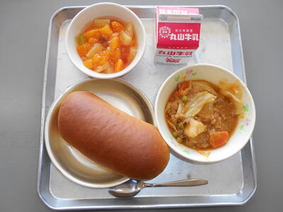 3月22日(金)、献立名(ビーフシチュー・そらとぶフレッシュサラダ・デザート)明日は卒業式。6年生にとっては今日が小学校最後の給食になります。学校のリーダーとして、朝の挨拶運動をはじめ、学校の行事では率先してみんなを引っ張ってきてくれましたね。小学校で身につけたことを大切にして、中学校生活を楽しんでくださいね。今まで本当にありがとうございました。今日は、卒業をお祝いして、デザートをつけています。