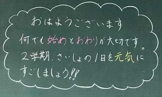 さて、朝、鍵開けのために教室を回ると、先生方から子どもたちへ素敵なメッセージが黒板に書かれていました。朝から、心がぽかぽかと温かくなりました。