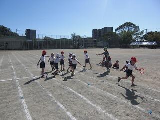 整備途中の土は、登り棒の下などに運びました。1年生が、体育で運動場にいたので、担任の先生に紹介し、楽しんでもらいました。