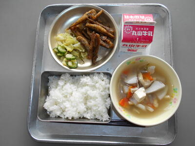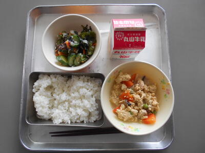 2月22日(木)、献立名(とりにくとだいずのにもの・ほうれんそうとツナのおひたし)今日は、大豆のついてのお話です。大豆をゆでると、あわがでます。この泡立ちの成分は「サポニン」といわれ、動脈硬化になりにくくする働きがあります。サポニンは、大豆製品の豆腐や納豆・みそにたくさんはいっています。サポニンは、ヨウドという成分を体の外に出してしまいます。ヨウドは新陳代謝を正常にするという、大切な働きがあり、海草類にたくさんはいっています。煮物には、海藻類である昆布が入っています。大豆を食べるときには、今日の給食のように、海草類をいっしょに食べるといいですね。