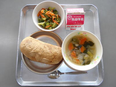 3月5日(火)、献立名(ポトフ・ブロッコリーのサラダ)今日は、ブロッコリーについてのお話です。ブロッコリ-は,今から100年以上も前に,ヨ-ロッパから伝わってきました。でも,よく食べられるようになったのは,30年前からです。ブロッコリ-は,キャベツが変化したものです。ですから,キャベツと同じように,のどの内側のまくを丈夫にしてくれる働きを持つビタミンが多く含まれ,風邪を予防し,胃や腸を丈夫にしてくれます。ブロッコリ-は茎も栄養たっぷりなので,捨てないで食べましょう。