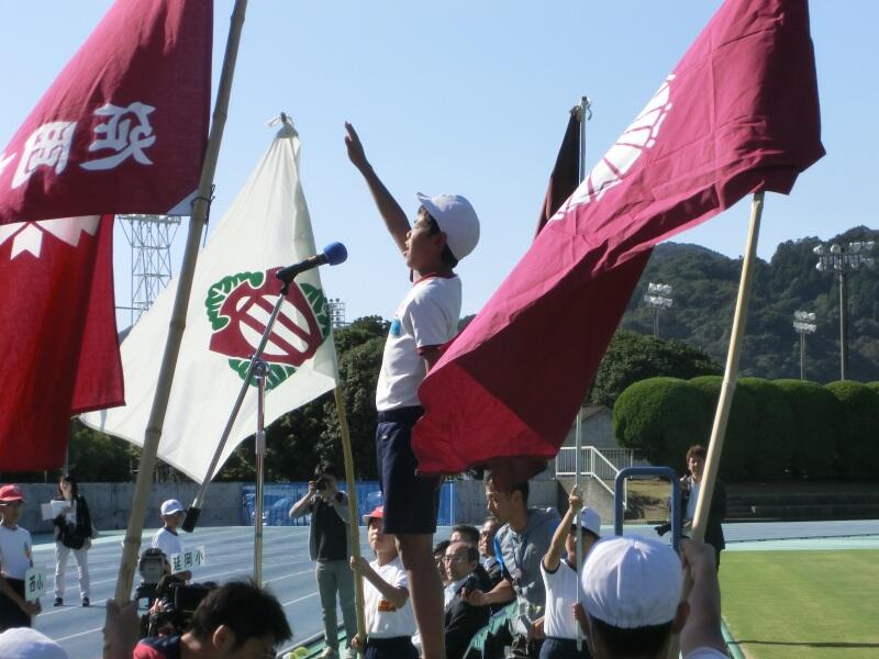 10月14日(水)に、西階陸上競技場で延岡市陸上教室(オリンピックゲームズ)が行われ、6年生全員が参加しました。天気にもめぐまれ、それぞれ自分の出場種目を一生懸命がんばりました。開会式では、佐藤たいすけさんが、参加した全児童の代表として選手宣誓を声高らかに堂々と行いました。