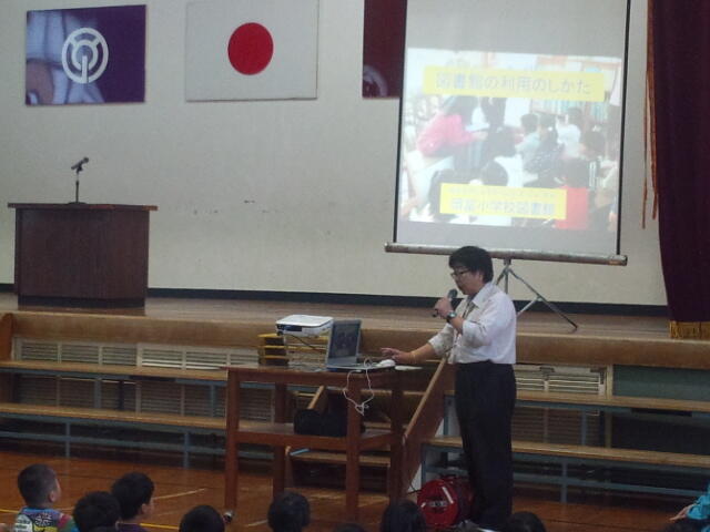 5月7日(木)に初めての全校朝会を行いました。初めに校長先生のお話がありました。そして、学習部の先生から今月の目標である「チャイムスタートをまもろう」についてお話がありました。また、図書主任の先生からは、図書室の使い方についてお話がありました。本校では7日から図書貸し出しを開始しました。全校のみんなにたくさんの本を読んで欲しいと思います。