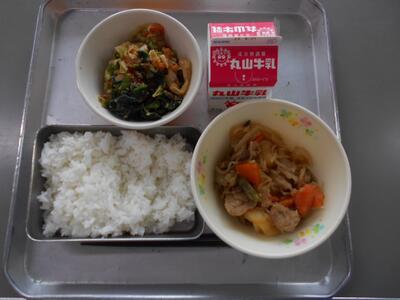 今日の給食は、牛乳、ごはん、じゃがいもとベーコンのにもの、せんぎりだいこんのすのものです。