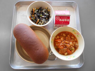 今日の給食は、牛乳、パン、じどっこチキンなんばん、そえキャベツ、コーンスープ、です。