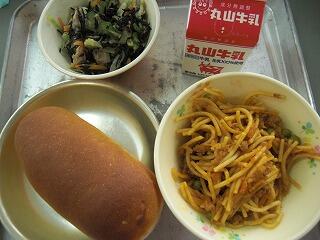 今日の給食は、牛乳、げんりょうコッペパン、ひむかミートスパゲティ、ひじきのサラダ、です。