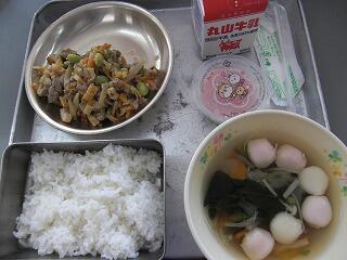 今日の給食は、牛乳、ごはん、ちくぜんに、すみそあえ、です。