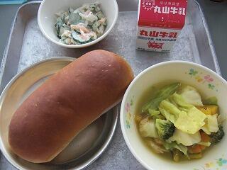 今日の給食は、牛乳、パン、はっぽうさい、チキンごぼうサラダ、です。