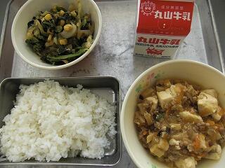 今日の給食は、牛乳、ごはん、マーボーどうふ、なのはなあえ、です。