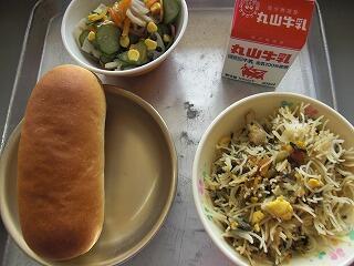 今日の給食は、牛乳、げんりょうコッペパン、たかなビーフン、れんこんサラダ、です。