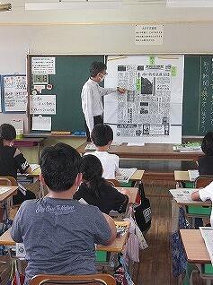 9月11日(金)、宮崎日日新聞社の延岡支社長が来校し、紙面の構成(新聞社名、発行日、見出し、記事、写真、コラム、広告)や文章構成等について、拡大された1面記事を使って、分かりやすく教えてくださいました。