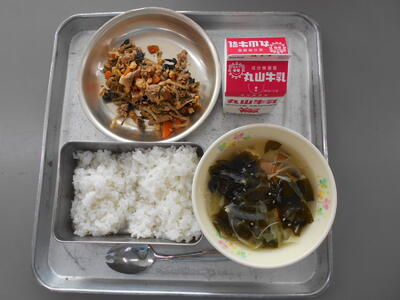 3月18日(月)、献立名(こうやどうふのたまごとじ・わかめのすのもの)今日は、海そうについてのお話です。長生きする人の食べ物を調べてみると海草をたくさん食べていることがわかりました。海そうに 含まれるミネラル(無機質)が働いて血管を丈夫にし、血圧を下げてくれるからだそうです。今日の給食で、酢の物にしている「わかめ」も海藻の仲間です。海藻の仲間は 他には、のり、こんぶ、もずく、ひじきなどがあります。みなさんは、海藻が好きですか?