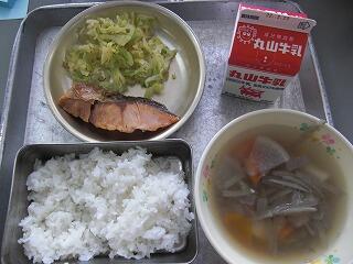今日の給食は、牛乳、ごはん、さかなのしょうがみそかけ、そえやさい、ごもくじる、です。