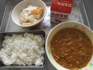 今日の給食は、牛乳、ごはん、キーマカレー、フルーツヨーグルト、です。