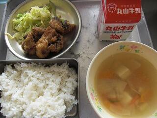 今日の給食は、牛乳、ごはん、とりのからあげ、そえやさい、とうにゅうみそしる、です。