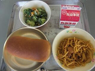 今日の給食は、牛乳、げんりょうコッペパン、スパゲティナポリタン、ブロッコリーのサラダ、です。