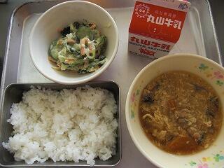 今日の給食は、牛乳、ごはん、豚肉のしょうが焼き、かきたま汁です。