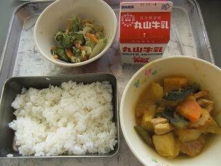 今日の給食は、牛乳、ごはん、かぼちゃのふくめに、ごまずあえ、です。