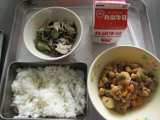 今日の給食は、牛乳、ご飯、とりにくとだいずのにもの、こまつなのおひたしです。