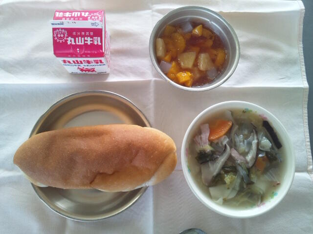 今日の給食は、牛乳、パン、ポトフ、フルーツあんにんです。