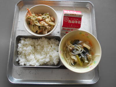 10月26日(木)、今日は、くきわかめについてのお話です。すのものに入っている、こりこりとした歯ごたえのある食品は、くきわかめです。茎ワカメとは、わかめの葉の芯の部分です。栄養的には、余分な塩分を体外に出してくれるアルギン酸や食物繊維、ミネラルを豊富に含んでいます。カロリーは少ないのに、ミミネラル分などが多いということで、健康を考える人には人気のある食品です。給食では一度湯がいて冷やしているので、ぬめりがありますが、しっかりとかんで食べて下さいね。
