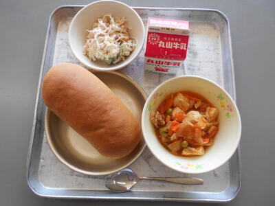 11月7日(火)、献立名(さつまいものシチュー・やさいのあまずあえ)今日は、さつまいもについてのお話です。さつまいもは、夏の初めから秋のはじめに収穫されて、冬から春までは保存されたものが出回ります。保存されたさつまいもがちょうど良い甘さになるのが冬頃で、春までおいしく食べられます。今日はシチューに入れています。さつまいもの甘みが出て、おいしいと思いますよ。