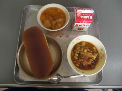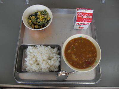 4月20日(木)、今日は、みなさん大好きなカレーライスです。カレーライスは、マーガリン10こを大きな鍋に溶かし、小麦粉5kgとカレー粉600グラムをこがさないように炒めながら鶏ガラスープでのばし、ルウを作ります。鶏ガラスープは、鍋に、水約70リットルと鶏ガラ8kgとキャベツの芯などの野菜くずを入れて、朝一番に火をつけ、時間をかけておいしいうまみのあるスープをとります。カレーの味付けは、塩こしょうの他に、ケチャップ、ソース、すりおろしりんご、チャツネ、しょうゆです。みなさんにおいしく食べてもらおうと、給食室では、6人の調理員さんが力を合わせて一生懸命作ってくださっています。