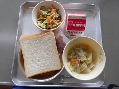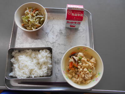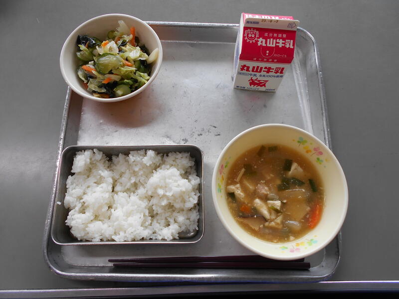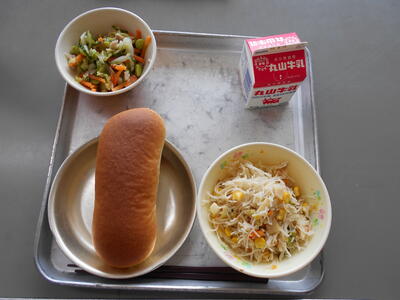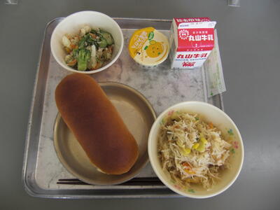 5月18日(木)、今日は、もやしについてのお話です。 細くて長くのびたもやしは、たいした栄養がないように思われがちですが、実は大違い。もやしは、ビタミンB1やB2やC、カルシウムを多く含みます。もやしには、ふつう私たちがもやしと呼んでいるブラックマッペもやし、中華料理によく使われる、ふつうのもやしよりも太い大豆もやし、糸もやしと呼ばれるとても細いアルファルファなどがあります。今日は、小松菜やキャベツと一緒に和え物にしています。残さず食べましょうね。