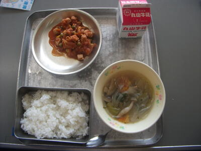 5月8日(月)、今日は、豚肉についてのお話です。豚肉は、体を作る「赤の食品」ですが、ビタミンB群を豊富に含み、その中でもビタミンB1に関しては100グラムあたりの含有量があらゆる食品の中でトップクラスです。鶏肉や牛肉などの他の肉類と比べても、5~10倍のビタミンB1を含んでいるといわれています。ビタミンB1は、ごはんやパンなどの糖質が体の中でエネルギーに変わるために必要な栄養素です。今日の給食では、玉ねぎやにんじん、ピーマンと一緒に炒めています。おいしくいただきましょう。