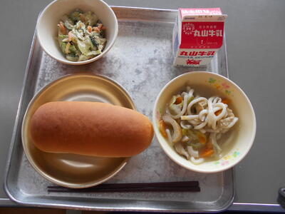 4月28日(金)、今日は、うどんについてのお話です。うどんは、奈良時代に、中国から伝わりました。作り方は、小麦粉を塩水でこねて、うすくのばして、細長く切ります。有名な郷土料理には、四国のさぬきうどん、名古屋のきしめん、山梨のほうとう、関東の鍋焼きうどんなどがあります。小麦粉と塩水で作っためんは、うどんのほかにもありますが、地域や太さによって呼び名がちがいます。うどんより少し細いのが「ひやむぎ」、ひやむぎより細いのが「そうめん」です。今日は、鶏肉、ちくわ、しいたけ、ごぼうやはくさい、にんじんなどの野菜も入った、具だくさんのごもくうどんです。