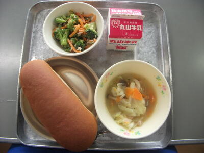 今日は、かぼちゃの入ったスープです。かぼちゃの旬は夏ですが、日持ちがするために、貯蔵して甘みが増したものを、秋から冬にかけて食べるとかぜ予防に良いといわれています。かぼちゃは濃い色の野菜で、この色のもととなる成分は、「のど」や「鼻」の粘膜を強くし、ウイルスが入ってくるのを防ぎます。だから、かぜに負けないじょうぶな体をつくってくれるのですね。今日のスープもおいしくいただきましょう。