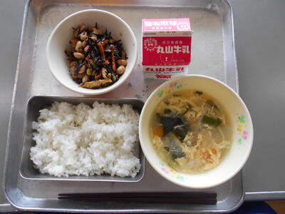 4月25日(火)、今日は、ひじきについてのお話です。ひじきは骨や歯をじょうぶにするカルシウムなど体によい栄養がたくさん含まれています。また、食物せんいも多く入っていて、おなかの調子をよくする働きもあります。干しひじきは、30分から1時間くらい水につけてもどします。煮物、炒めもの、酢の物などに使われます。今日の給食のように、サラダにしてもおいしいですよ。