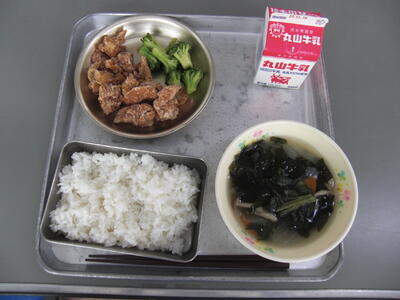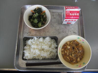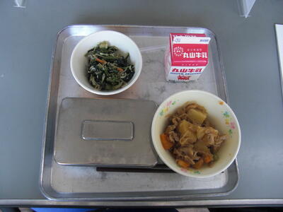 今日は、宮崎牛の「牛丼」です。牛肉は消化吸収のよいたんぱく質が多く、また、貧血の予防をする鉄分や、体の調子をよくするビタミンBもたくさん入っています。肉そのものはもちろん、脂にも独特の風味とコクがあります。つかれたときは、牛肉を食べて元気をだすというように、古くから、スタミナ源としてされてきました。今日の牛肉は、給食応援物資として延岡市の方から提供していただきました。感謝していただきましょう。