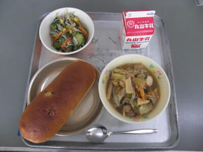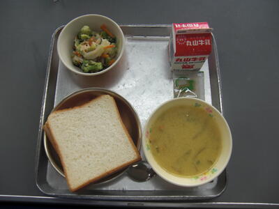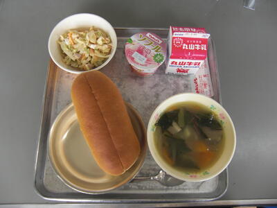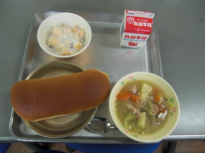 サラダパンとは、滋賀県のあるパンやさんで作られていたのがテレビで紹介され、有名になりました。始まりは、今から57年ほど前に、きざんだキャベツをマヨネーズで和えてパンにはさんでいたそうですが、時間がたつとキャベツから水分がでることから、滋賀県で習慣として作られているたくあんをキャベツの代わりにはさんでみたところ、好評で、そのままサラダパンとして売られるようになったそうです。給食では、たくあんだけでは栄養が足りないので、始まり当時のキャベツに加え、にんじんやハムも入れています。美味しく食べてもらえるとうれしいです。