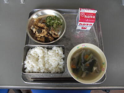 今日は、宮崎県産の「ぶり」に、塩こしょうと片栗粉をつけ、油で揚げている料理です。「ぶり」は、体を作る元になる「たんぱく質」や、エネルギーの元になる「脂質」を豊富に含んだ魚です。特に、脂質に含まれる「DHA」「EPA」と呼ばれる成分は、脳の活性化や動脈硬化の予防などが期待されています。ぶりは、成長するにつれて名前が変わる出世魚です。宮崎県内では、成長する順番に「もじゃこ」「はまち」「ぶり」と呼ばれています。今日の「ぶり」は、給食応援物資として宮崎県の方から提供していただきました。また、汁物は、延岡の郷土料理、しいたけがたっぷり入った「はちはい汁」です。ふるさとの味を大切に守っていきたいですね。