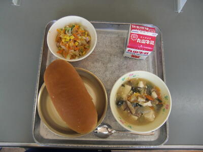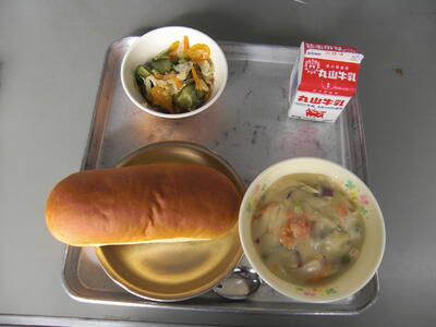 「ポトフ」は、肉のかたまりと野菜を煮込んだフランスのスープです。長い時間煮込むので硬い肉も柔らかくなります。野菜は、にんじん、たまねぎ、じゃがいも、かぶなどを使います。今日の給食では、鶏肉とウインナー、じゃがいも、たまねぎ、にんじん、キャベツを煮込んでいます。肉や野菜のうまみがでて、おいしいと思いますよ。