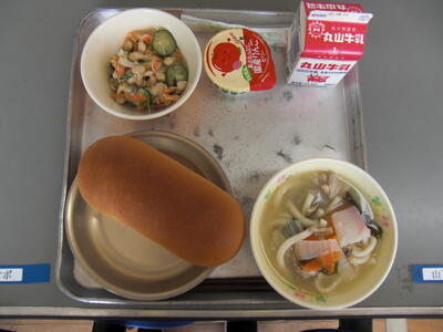 今日は、みなさんの大好きな「たこ焼き風」です。「たこ」にはどんな栄養があるか知っていますか?「たこ」はたんぱく質を多く含み、体をつくる赤の食品です。「たこ」には、「いか」と同じようにタウリンという栄養素が豊富に含まれていて、血中のコレステロールを下げ、動脈硬化などを予防する働きがあります。その他にも、疲労回復を助ける働きもあります。ただ、消化に少し時間がかかるので、しっかりかんで食べましょう。