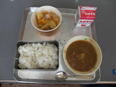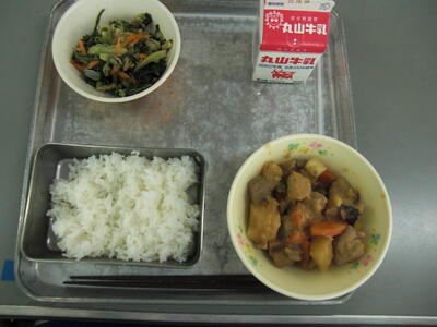 今日は、西小学校4年生の皆さんからのリクエストメニューです。4年生の皆さんに、人気ナンバー3は「からあげ」、ナンバー2が「揚げパン」、そしてナンバー1が、今日の給食に出ているカレーライスでした。カレーライスは、マーガリン10こを大きな鍋に溶かし、小麦粉5kgとカレー粉500グラムをこがさないように炒めながら鶏ガラスープでのばし、ルウを作ります。鶏ガラスープは、朝一番に、鍋に水約70リットルと鶏ガラ8kgを入れ、キャベツの芯などの野菜くずと一緒に煮込んで時間をかけておいしいうまみのあるスープを作ります。カレーの味付けは、塩こしょうの他に、ケチャップ、ソース、すりおろしりんご、チャツネ、しょうゆです。みなさんにおいしく食べてもらおうと、給食室では、6人の調理員さんが力を合わせて一生懸命作ってくださっています。西小4年生のみなさん、リクエストありがとうございました。