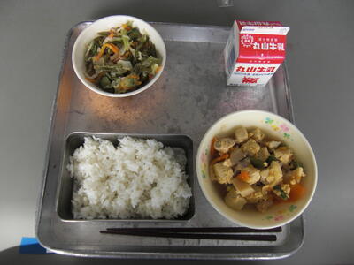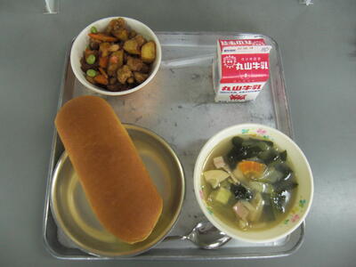 今日は、大豆のついてのお話です。大豆をゆでると、あわがでます。この泡立ちの成分は「サポニン」といわれ、動脈硬化になりにくくする働きがあります。サポニンは、大豆製品の豆腐や納豆・みそにたくさんはいっています。サポニンは、ヨウドという成分を体の外に出してしまいます。ヨウドは新陳代謝を正常にするという、大切な働きがあり、海草類にたくさんはいっています。ですから、大豆を食べるときには、今日の給食のように、昆布など海草類といっしょに食べると良いですね。