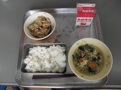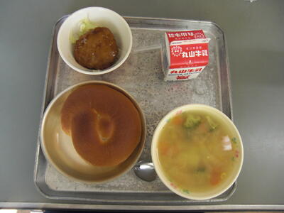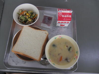 今日は、かぼちゃの入ったスープです。かぼちゃの旬は夏ですが、日持ちがするために、貯蔵して甘みが増したものを、秋~冬にかけて食べるとかぜ予防に良いといわれています。かぼちゃは濃い色の野菜で、この色のもととなる成分は、「のど」や「鼻」の粘膜を強くし、ウイルスが入ってくるのを防ぎます。だから、かぜに負けないじょうぶな体をつくってくれるのですね。