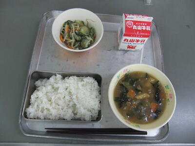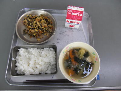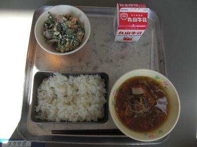 今日は、わかめについてのお話です。わかめは、一般に葉の部分をわかめ、根元から葉の部分への中心部の茎にあたるものを茎わかめといいます。わかめの成分は、ミネラル、カルシウム、鉄分など健康な体づくりに必要なものを多く含んでいます。今日はスープに入っています。