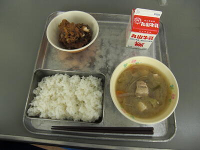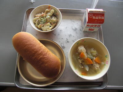 今日は、手作りの肉団子が入ったスープです。肉団子は、とりのひき肉と、ぶたのひき肉と、卵、パン粉を混ぜて作ります。全体で、約15キログラムの肉団子のたねを、小さくちぎり、丸めてスープに入れます。たくさんの量のお肉をこね、団子にするのは大変な作業です。給食を作ってくださる調理員さんに感謝して食べましょう。