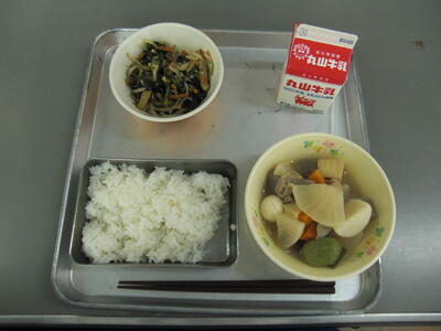 寒い日には「おでん」がおいしいですね。もともとは、焼き豆腐にみそをぬったものを田楽と言っていました。江戸時代の半ば頃に、こんにゃくの田楽も作られるようになり、今の「おでん」の形になったと言われています。関東ではこんぶやかつおぶしでだしをとった濃いめのしょうゆ味で、関西では鶏がらでだしをとったうす味だそうです。今日の給食では、延岡産のいりこでだしをとり、いろいろな食材を入れています。