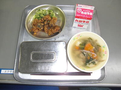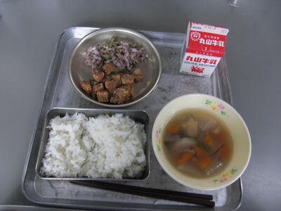 今日は、魚にかたくり粉をつけて油で揚げた料理です。今の季節にたくさんとれる、旬のゆずの皮をみじん切りにしたものと、果汁を、みそに混ぜて作ったタレでからめています。ゆずの良い香りが、魚の臭みを消して、美味しく食べてもらえると思います。魚は、あじです。もちろん国内産です。汁物は、食物繊維たっぷりのとりごぼうじるです。