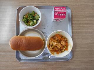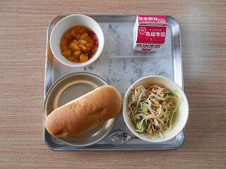 今日の献立は、牛乳、ミルクパン、とうふのチリソース、ドレッシングサラダです。