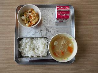 今日の献立は、牛乳、ご飯、はちはい汁、イワシのしょうが煮、添え野菜です。