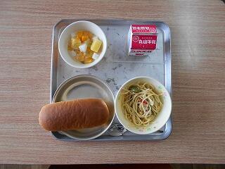 今日の献立は、牛乳、減量コッペパン、サマースパゲッティ、フルーツミルクかんてんです。