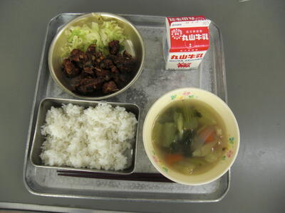 今日は、「シイラ」という名前の魚を油で揚げて、さとう、ケチャップ、ソース、青のりなど「たこやき」と同じ味のタレでからめた料理です。味はいかがですか?スープは、チンゲンサイやしめじ、にんじんなど具だくさんにしています。野菜もしっかり食べましょうね。