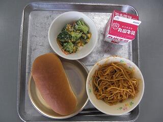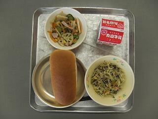 今日の献立は、「牛乳」「減量コッペパン」「塩やきそば」「海藻サラダ」でした。